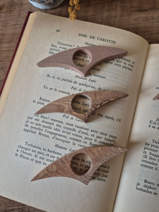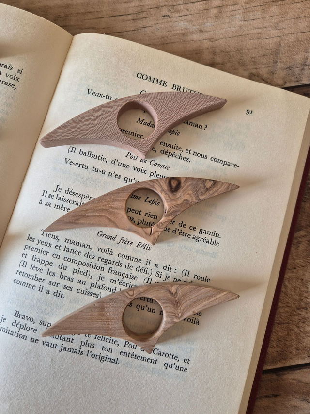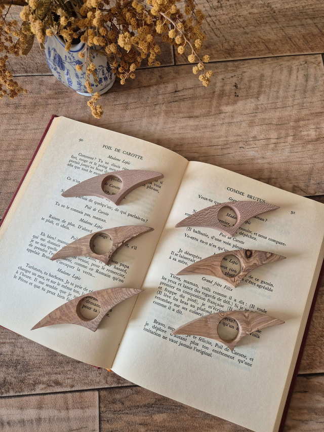 Chaque pièce est unique et aléatoire. Le bois, avec ses veinures naturelles, confère à chaque bague un charme authentique. Légère et agréable à porter, elle accompagne parfaitement vos moments de lecture.