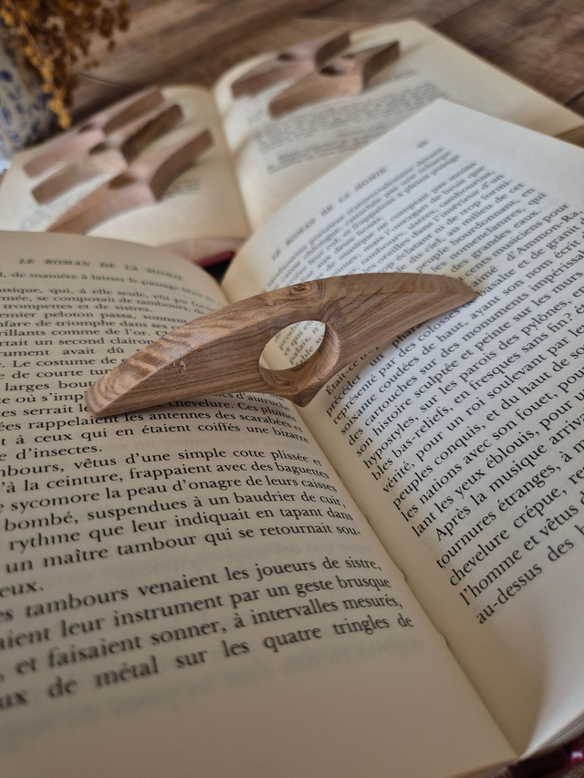 Très pratique, la bague se glisse sur le pouce pour maintenir les pages ouvertes sans effort, rendant la lecture plus confortable, même d’une seule main.